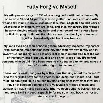 There isn’t a week that goes by without me thinking about the “what if” and the regrets I have for the choices and decisions I made, and I hurt thinking about the pain I caused my sons and what they went through. I have not been able to Fully Forgive Myself for those choices and decisions I made many years ago. But I’ve been trying to correct things and hope I will succeed, especially for my sons, and hope it’s not too late to correct things.